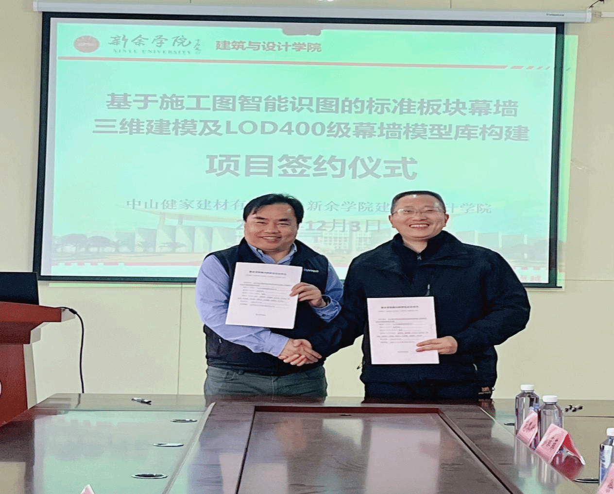 12月3日,建设学院与中山市健家建材有限公司在二楼会议室举办《基于施工图智能识图的标准板块幕墙三维建模及LOD400级幕墙模型库构建》横向课题签约仪式,建设学院党委书记徐理、副院长徐珊,以及健家公司董事长、新余学院人文学院2002届英语教育专业优秀毕业生优秀校友肖富荣参加签约仪式,校企双方代表及学院教师代表齐聚一堂,见证这一重要时刻。