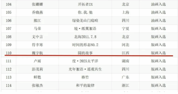 近日,中国美术家协会官方网站正式公布第十届中国北京国际美术双年展主题展国内作品入选名单,我校建筑与设计学院专任教师魏宇航的版画作品《圆的故事》成功入选。此次入选是我校教师在该顶级展览中的重大突破,充分彰显了我校美术创作的专业水准。